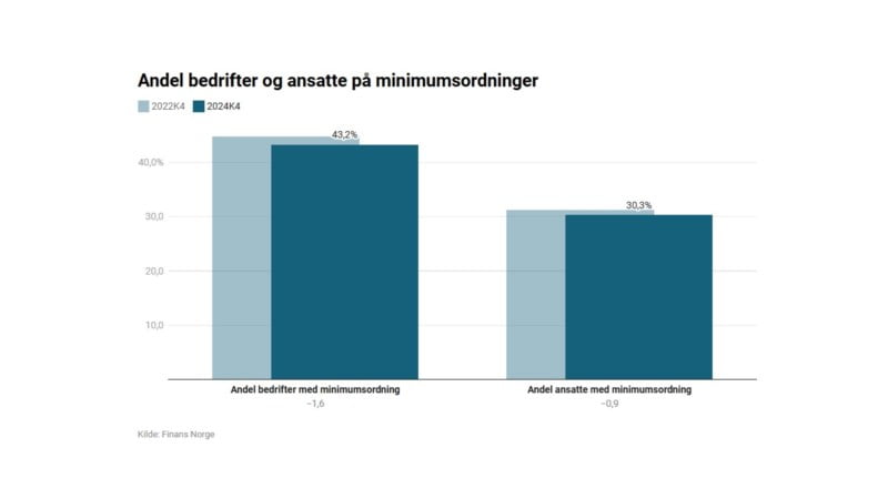 Finans Norge sin undersøkelse fra 2024 viser at 43 % av bedriftene opererer med minimumssatser, altså 2 % sparing av lønn og ingen tilleggssats. Andelen ansatte som omfattes av minimumsordning er noe lavere, og ligger på 30 %. Det skyldes blant annet at det ofte er de minste bedriftene som velger de laveste sparesatsene. Totalt sett innebærer dette at omtrent 600.000 ansatte i Norge har innskuddspensjonsordninger med minimumssatser.