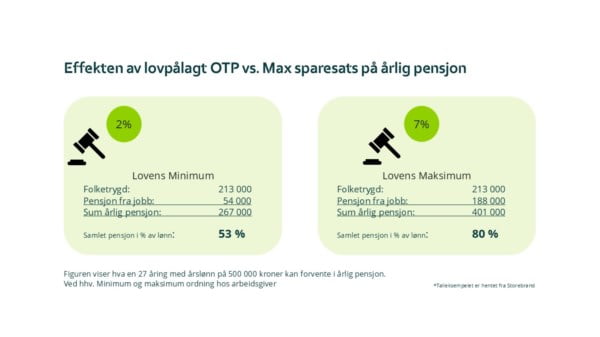 Eksempelet over fra Storebrand tar utgangspunkt i en ung person som skal jobbe til sammen i 40 år. Utregningen legger til grunn utbetaling av pensjon i 20 år. Beløpene er inflasjonsjusterte, og baserer seg på avkastningssatser som er bransjestandard. Eksemplet viser at ved å øke sparingen til 7 % av lønn, vil den ansatte gå fra en halvering av inntekten til et pensjonsnivå som i stor grad muliggjør opprettholdelse av dagens livsstil som pensjonist. De fleste vil ha noe reduserte utgifter når man er pensjonist, slik at et nivå på 80 % - 90 % av inntekten regnes som et akseptabelt nivå.